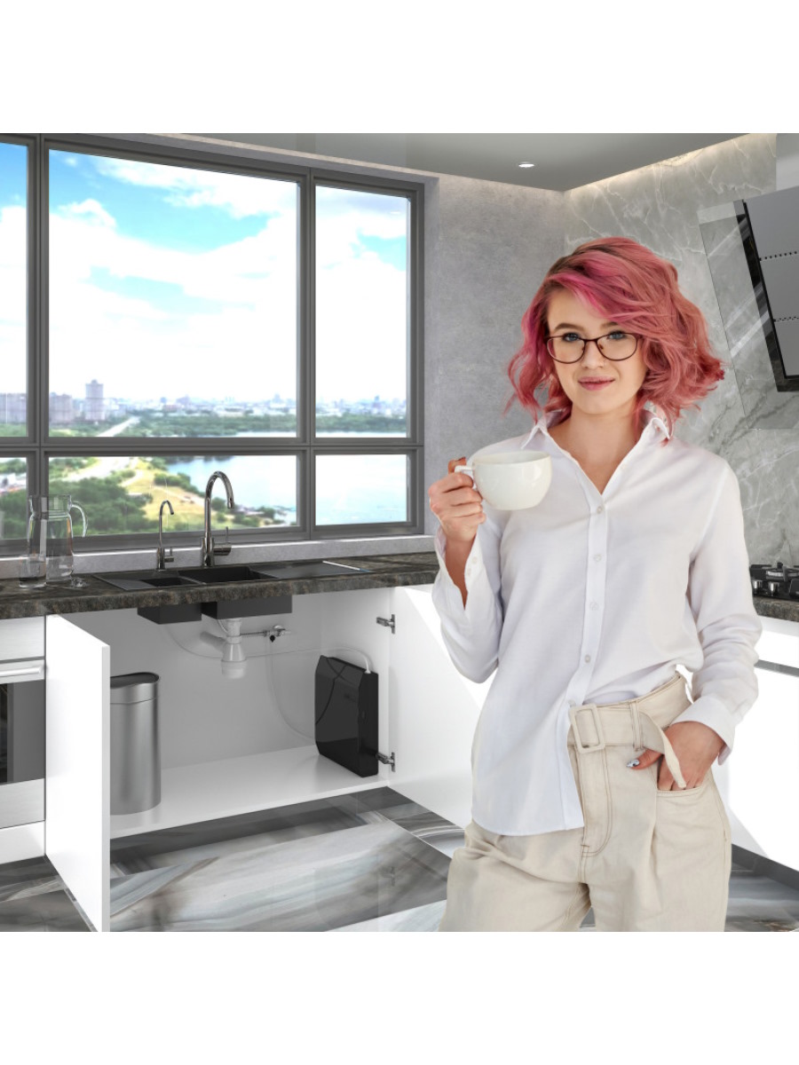 - В компактный корпус толщиной 8.5 см вмонтировано два фитинга X274 для подключения линии входа сырой воды и линии выхода фильтрованной воды.